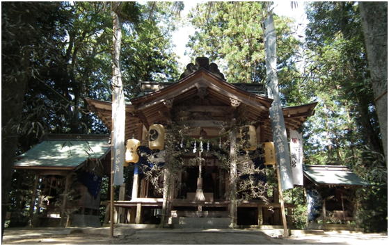 本 殿 一間社神明造、銅板茸(間口6尺五寸、奥行9尺3寸) 明治7年再建 付属社属 幣殿(3.5坪)拝殿(10坪)、 |
