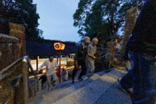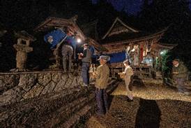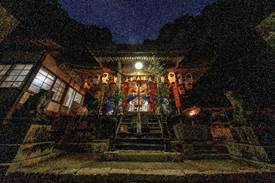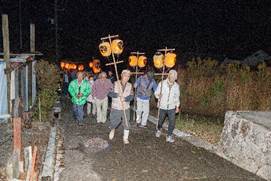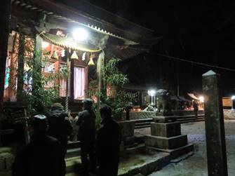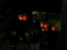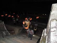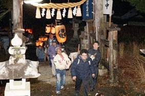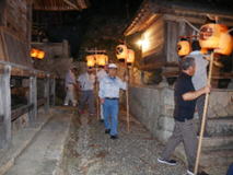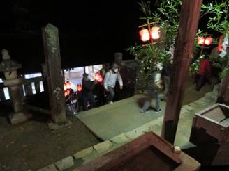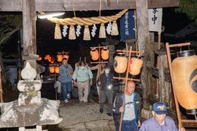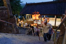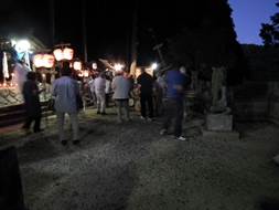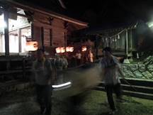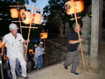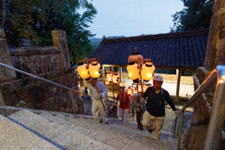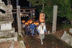 20:00 神殿入り (7:30頃より当屋を出て第二鳥居に集まり、太鼓・鉦を響かせて宮に上がる三組の提灯行列)