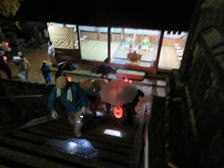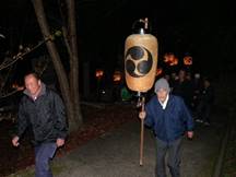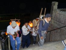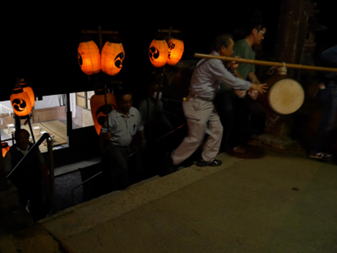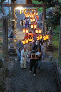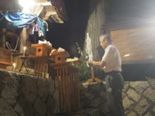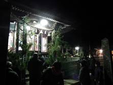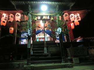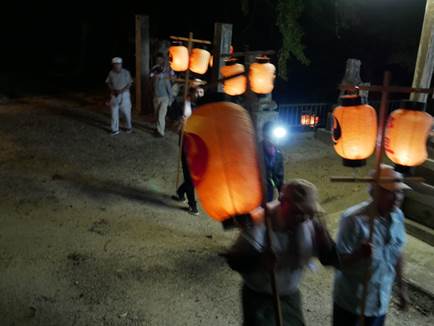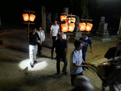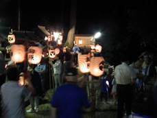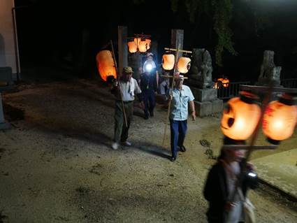 猛暑の中、提灯へろうそくの灯をともし、神儀の音も高らかに家の神様と共に宮へ上がられました。