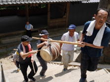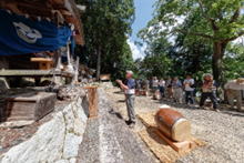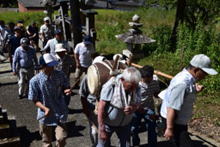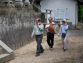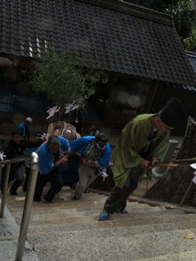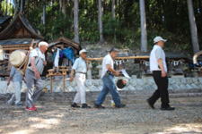 14時祭典へ向けて、猛暑の一番暑い時に神儀を打ちながら掛け声高らかに宮へ上がられました。