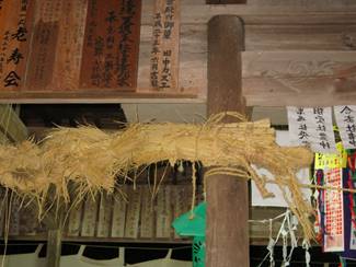 荒神舞では、造花を始め、切り飾りをし、藁蛇・ゆぐり・俵を作り、五穀などお供えをし、荘厳にお祭をします。神事の中で最後の五穀収めが重要なもので、ゆぐりに五穀を納め、藁蛇とゆぐりと俵を合祀神社へ、ゆぐりと俵を大山社と合斎社へ納めます。氏子全員にて綱よりをし、その時、五穀を各家から持ち寄り供えます。五穀とは、米、麦、黍、粟、豆など穀類で、何種類かを一握り持ち寄ります。
