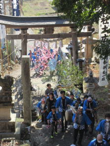 神儀が上がります。道切(猿田彦)を先頭に獅子舞・鉦・太鼓・花鉾・屋台が上がります。